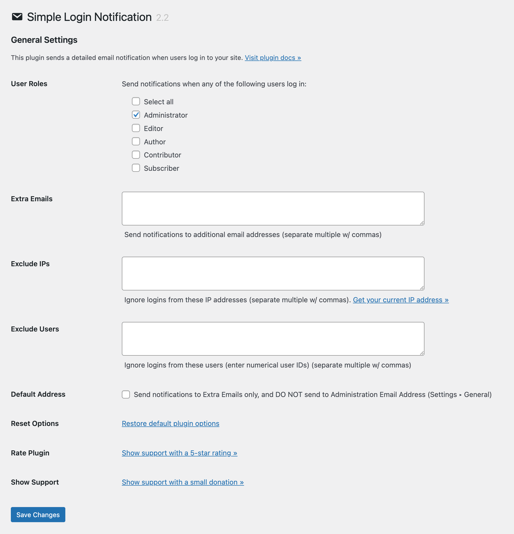 By default, email alerts are sent only when admin-level users log in to your site. To include additional user levels/roles, check out the plugin setting, “User Roles”.