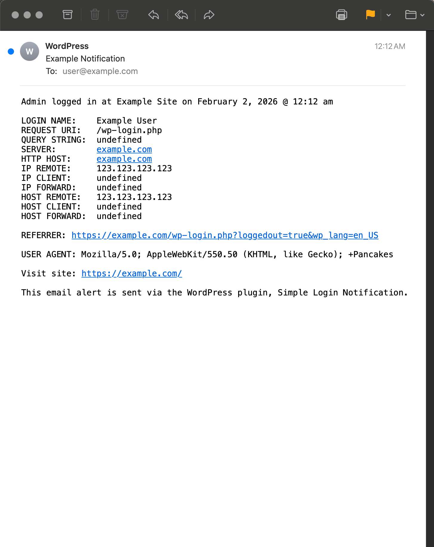 Admin logged in at Example Site on February 1, 2026 @ 10:47 pm